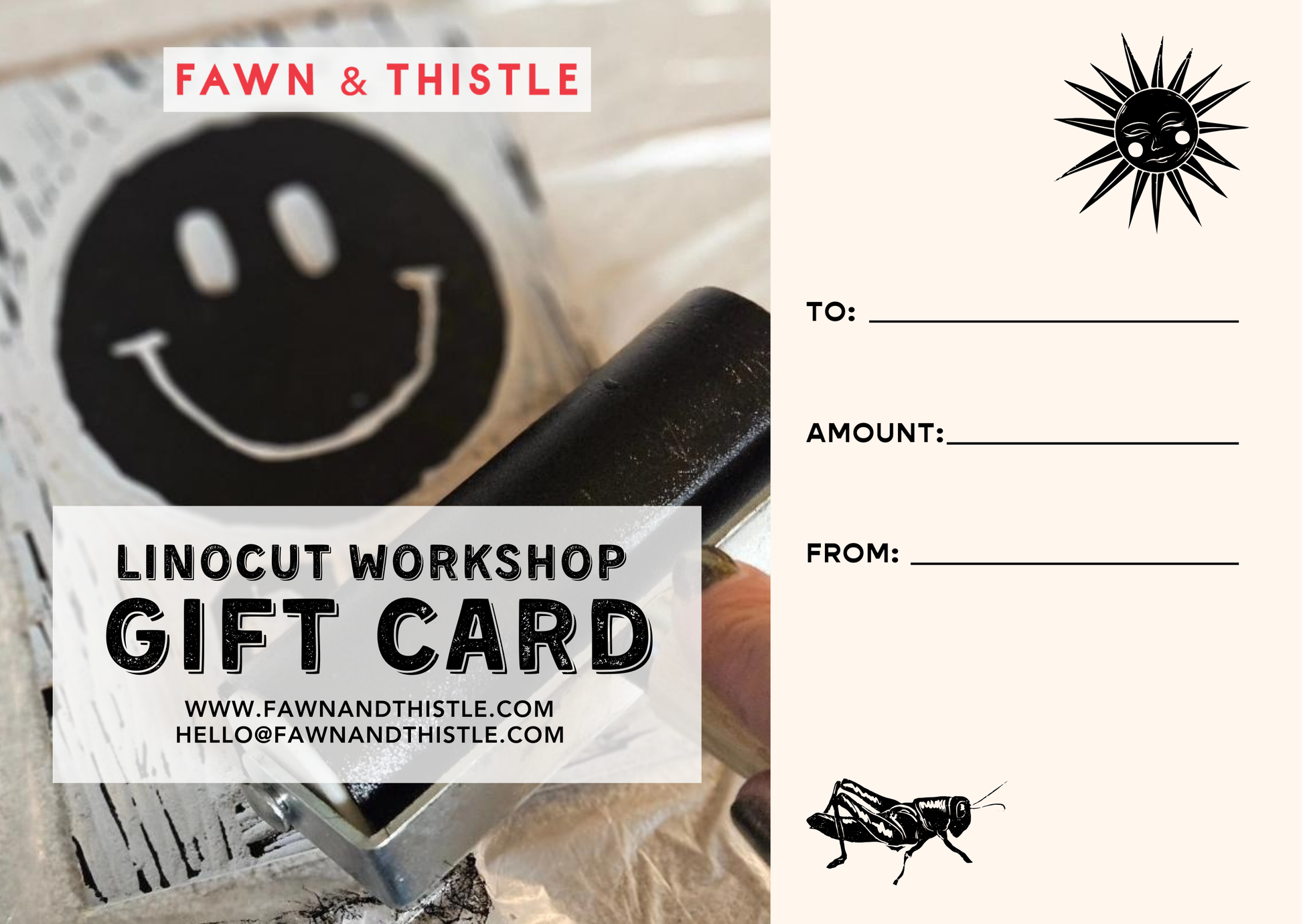 Unlock your creativity with our Lino Cut Workshop Gift Card! Get hands-on experience with in lino cut printmaking with Fawn & Thistle founder Kirsten, and learn a new skill. Perfect for gifting to a loved one for Christmas or Birthdays. Get ready to make beautiful and unique prints with this gift card.