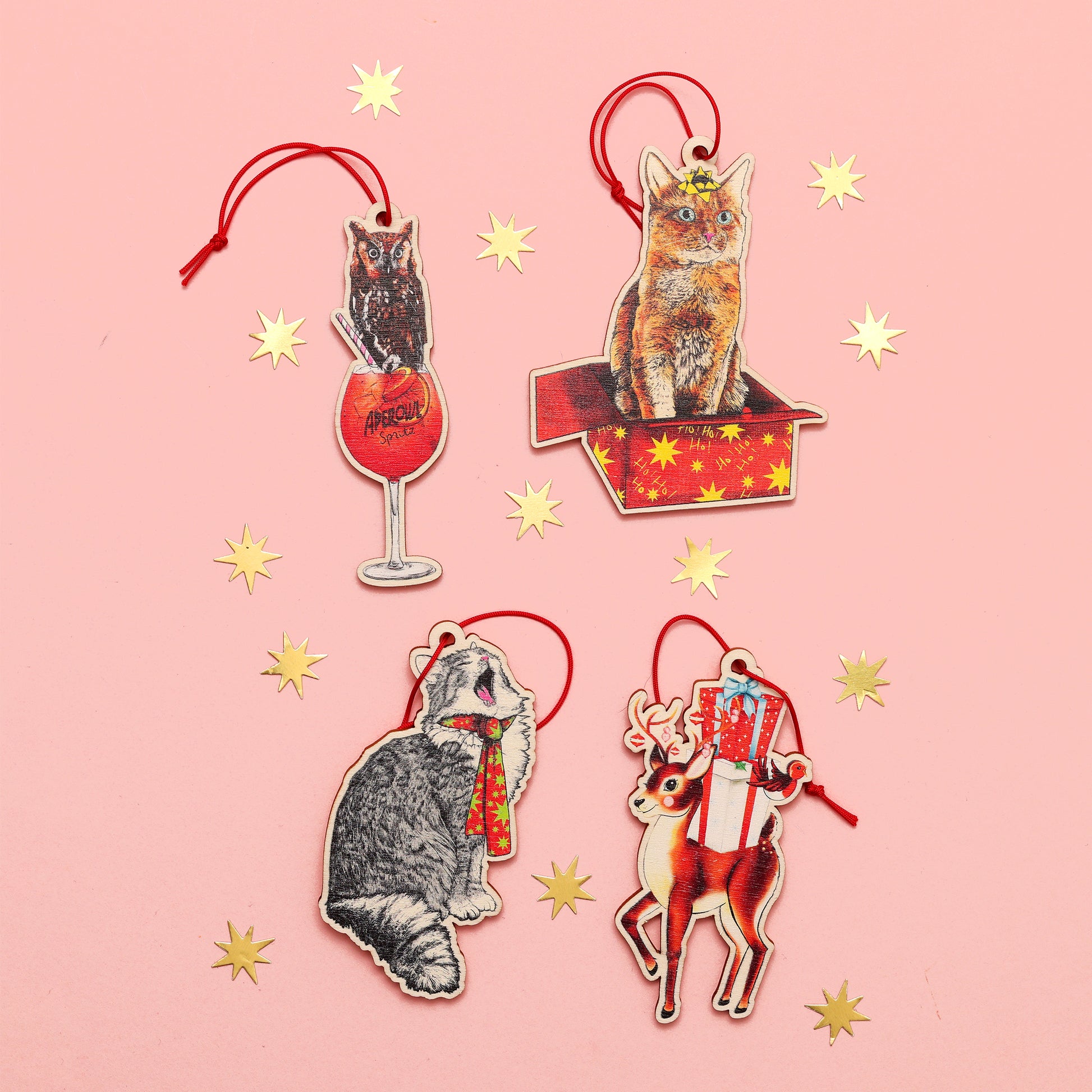 Each decoration is designed in our Kent studio and sustainably made in the UK from responsibly sourced wood. Printed in vivid detail and hand-finished with a bright red ribbon, it’s ready to hang proudly on your tree, mantel, or anywhere that needs a touch of festive feline flair.