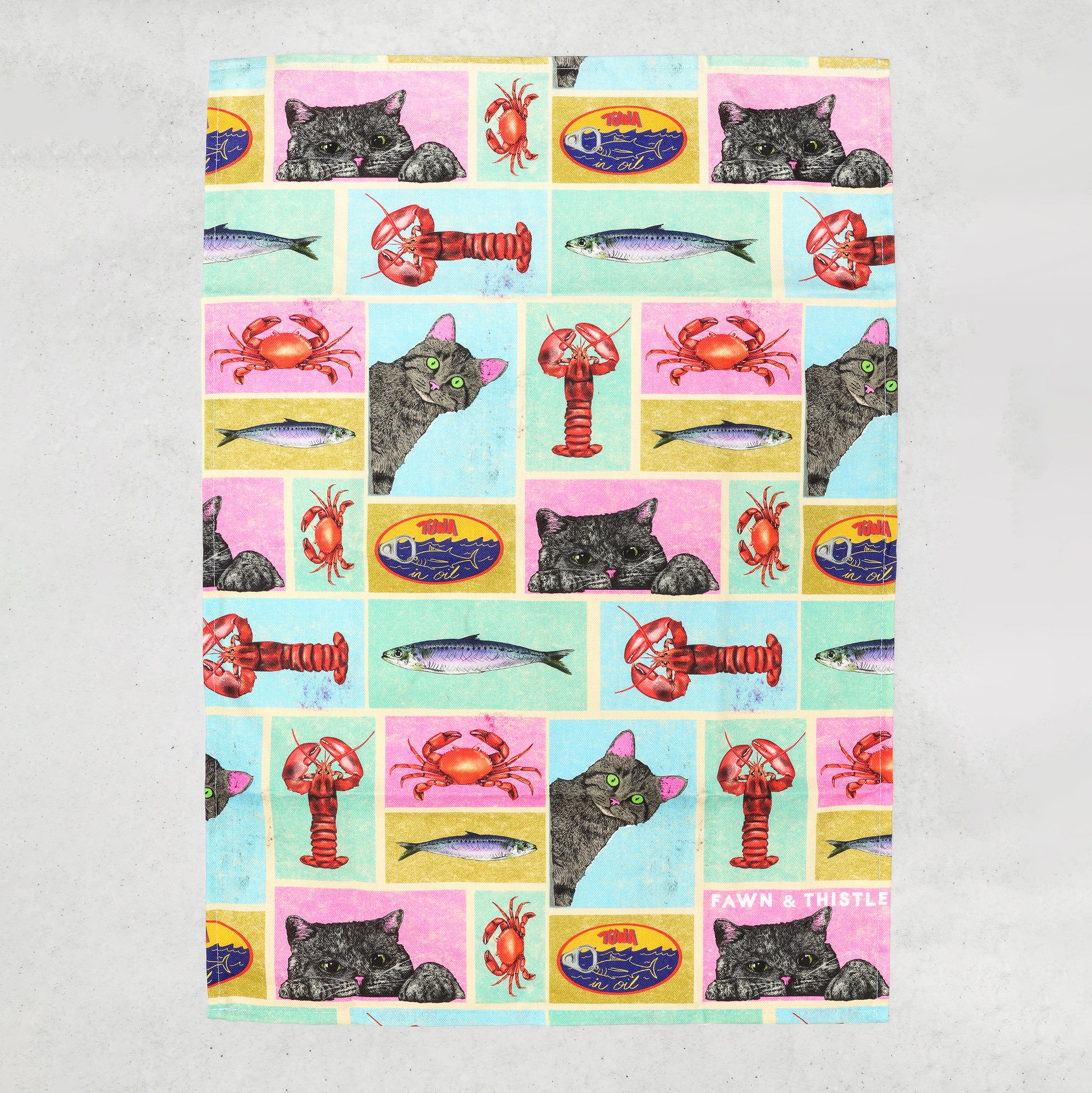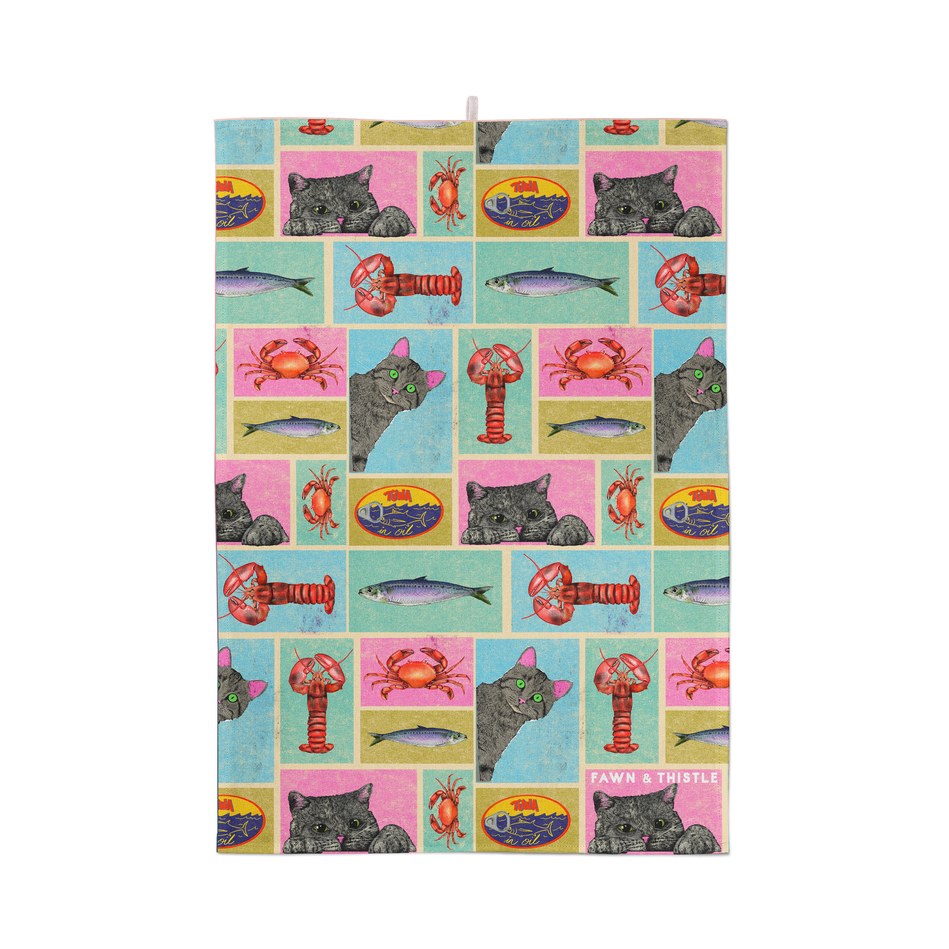 Add playful charm to your kitchen with our Cat's Kitchen Tea Towel, featuring curious cats, sardines, lobsters, crabs and retro tin labels in a colourful riso print style. With its bold pops of pink, turquoise, yellow and green, this quirky design is perfect for cat lovers and foodies alike.