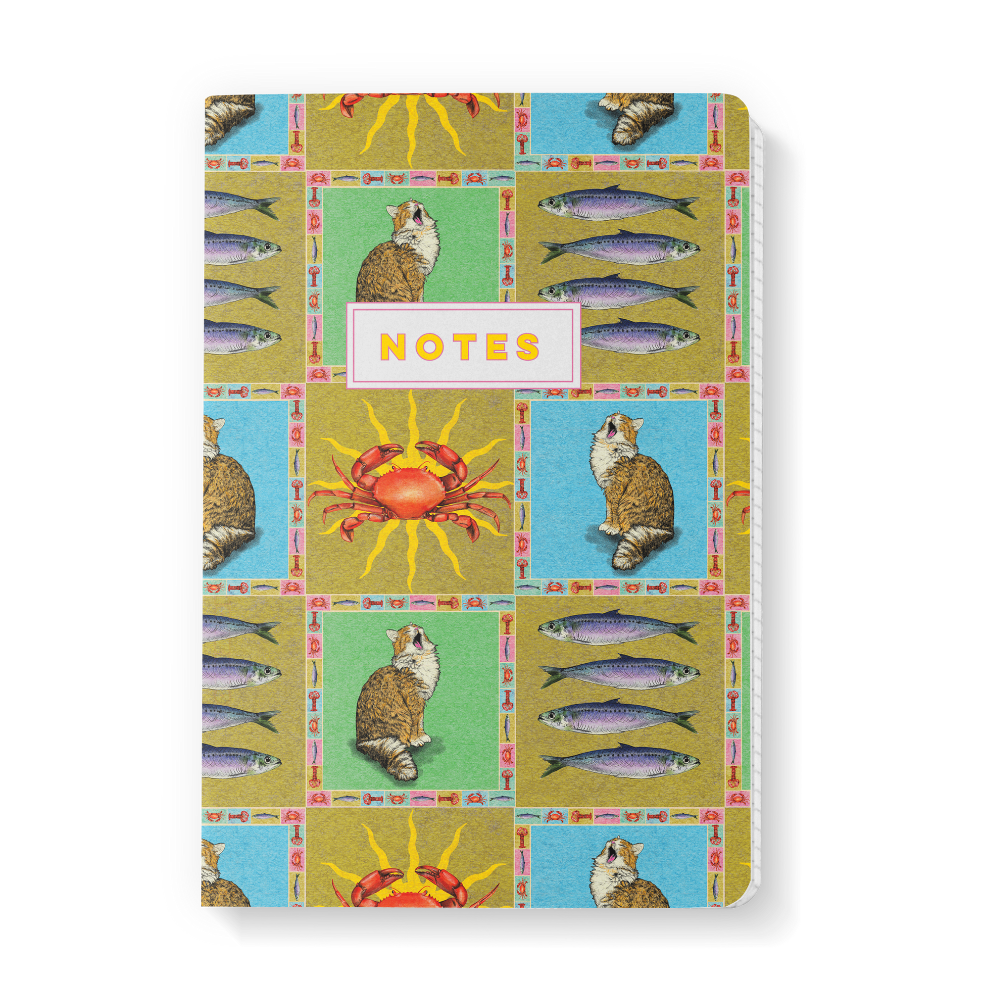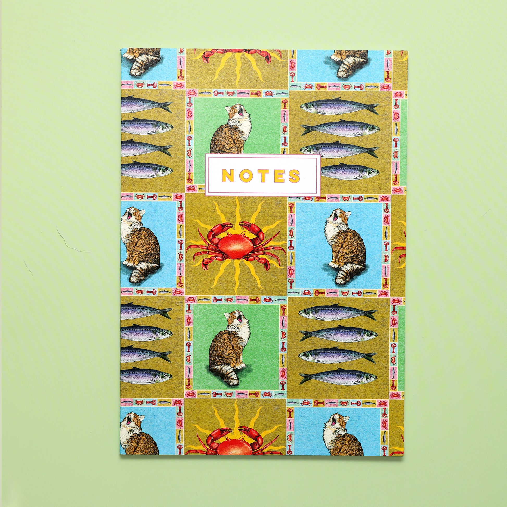 Inspired by the chaos of dinnertime and the ocean’s delights, our Feed the Cat Notebook brings together two of our favourite things — cats and seafood! Featuring a charming patchwork of sardines, crabs, and the ever-expectant feline, this colourful A5 notebook is perfect for jotting thoughts, doodles, or daily lists.