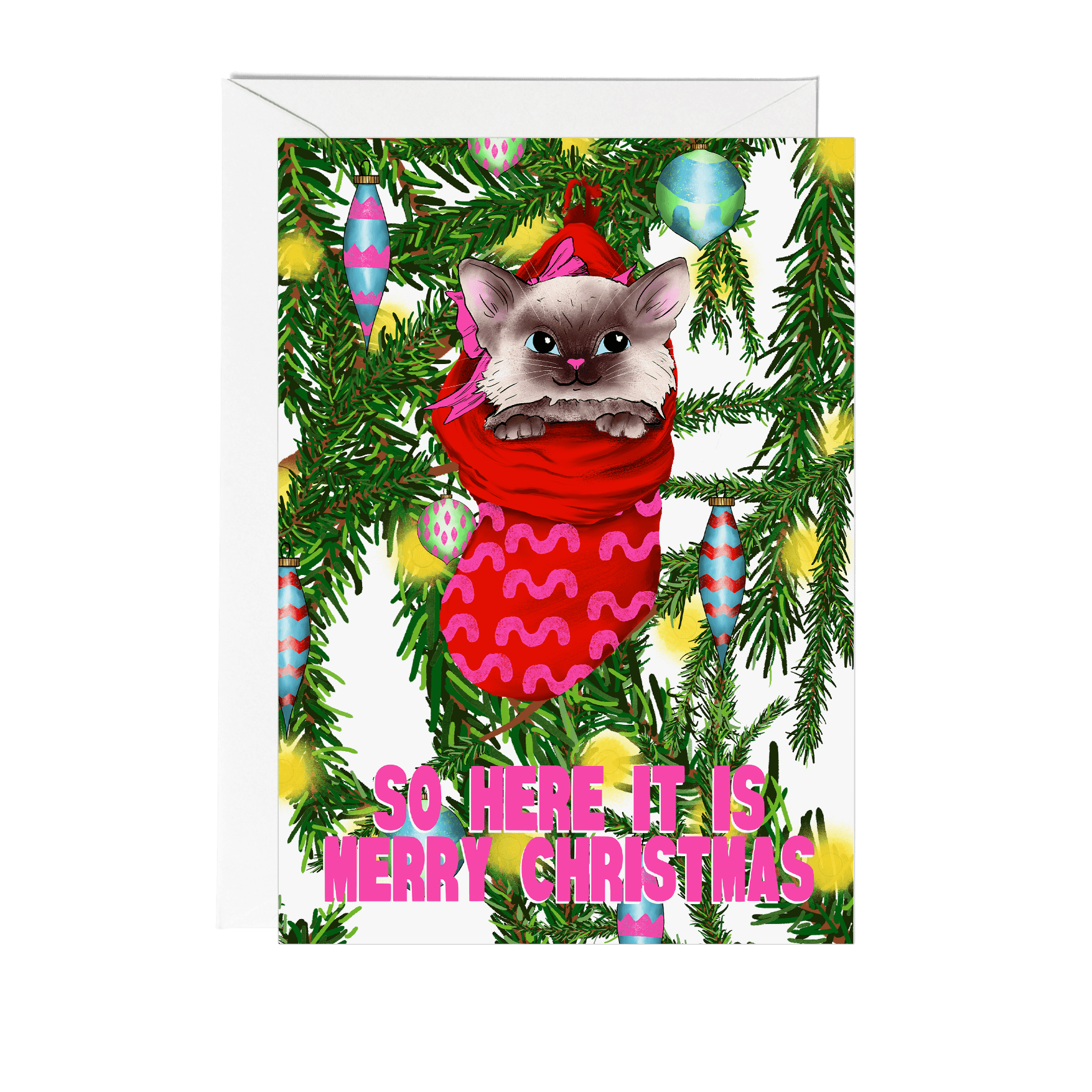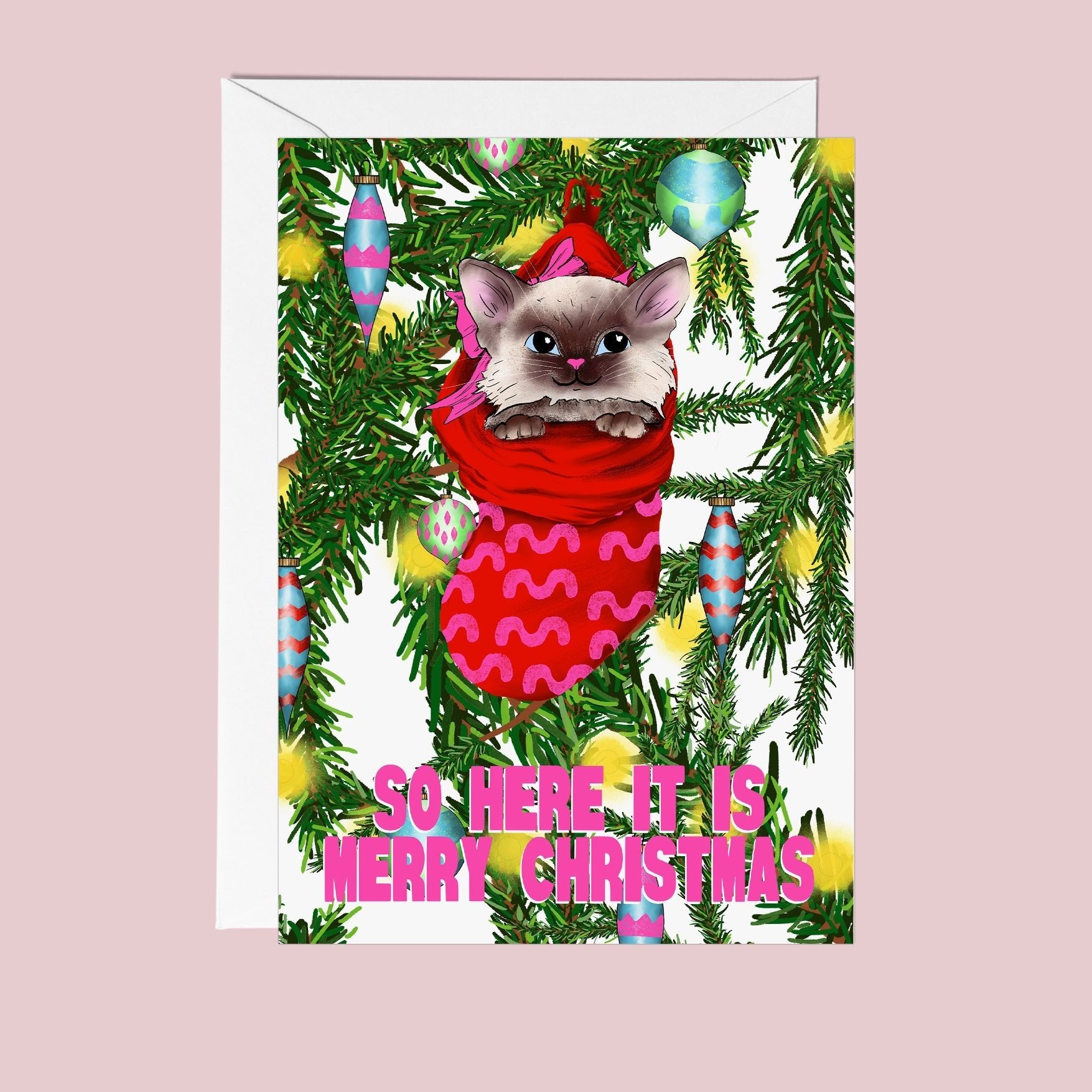 This cute little kitty has got all cosy in it's stocking and is wanting to wish you a merry Christmas! Inspired by the mid-century kitsch and retro illustrated christmas cards from the 50's, because we love a bit of nostalgia, this card is sure to make the recipient smile