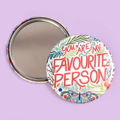 The uplifting message, "you are my favourite person' is surrounded by folk art inspired florals and foliage in oranges, pinks and greens to complete the pretty design. The small makeup mirror is the ideal size to go in any handbag or purse. The pocket mirror flips over to reveal a 58mm mirror that’s perfect for check-ups while on the go. It makes a great addition to your purse or it makes a great gift for a loved one who is potentially needing this reminder